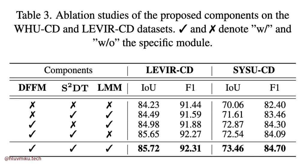 三个模块全去掉,只使用DINO feature在LEVIR-CD上效果感觉已经很不错了,其他的感觉有点像个添头,但毕竟也提升了两三个点,其实也挺多的了。