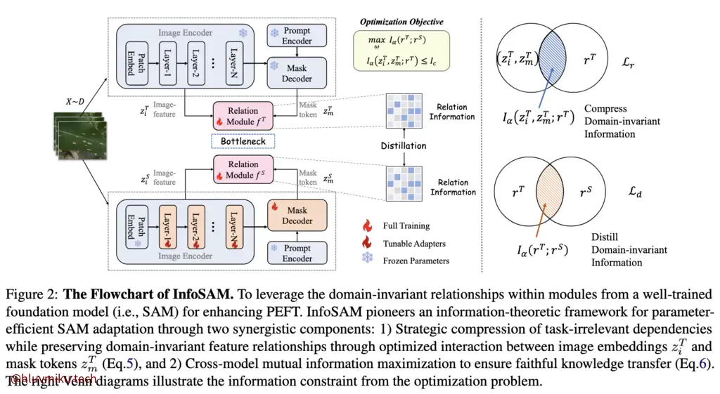 文章认为,现有的PEFT后训练微调会忽视一些模型内嵌的领域不变关系,直接训练可能造成冗余或者破坏现有内在关系。于是本文从信息论角度来进行蒸馏+微调,通过巧妙设计Loss和Relation Module设计让模型学到领域不变关系。