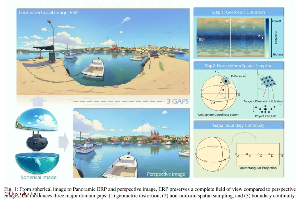 - Non-uniform Spatial Sampling(非均匀采样):成因是“Each horizontal line of the ERP corresponds to a constant latitude on the sphere, which leads to the density of pixels to vary across different latitudes.”