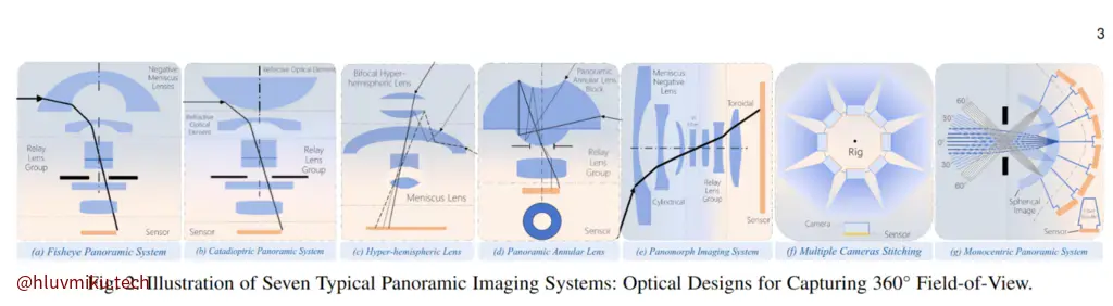 之后,文章讲了全景领域的一些背景知识,包括7种全景成像系统、全景拼接的相关技术以及几种不同坐标表示。