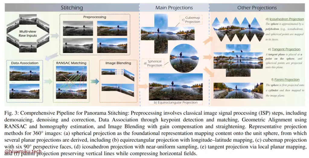 这是一篇全景方向的综述,主要总结了全景任务的3个挑战:severe geometric distortions near the poles, the non-uniform sampling in Equirectangular Projection (ERP), the periodic continuity of panoramic boundaries。其中几何畸变和非均匀采样我认为是因果关系。之后文章把全景分为四个大方向:visual quality enhancement and assessment, visual understanding, multimodal understanding, visual generation。