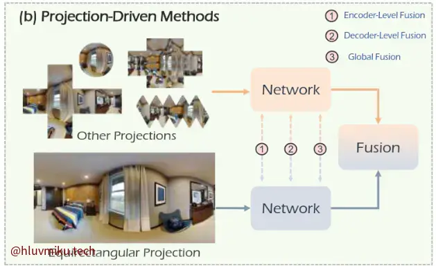 投影驱动的方法则尝试将全景图以适当的方式进行重新投影,如用一个正方体展开、用二十面体展开等。这种做法一般还伴随着将不同投影方法进行融合。