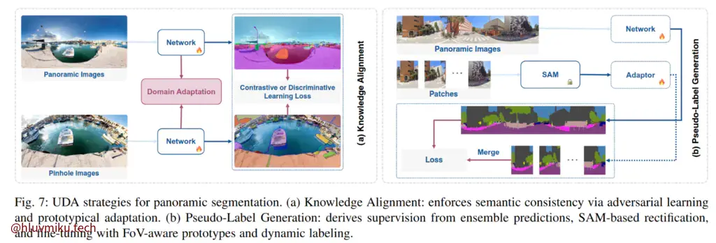 Knowledge Alignment focuses on transferring semantic consistency from the source perspective domain to the target panoramic domain, through explicit or implicit alignment mechanisms.